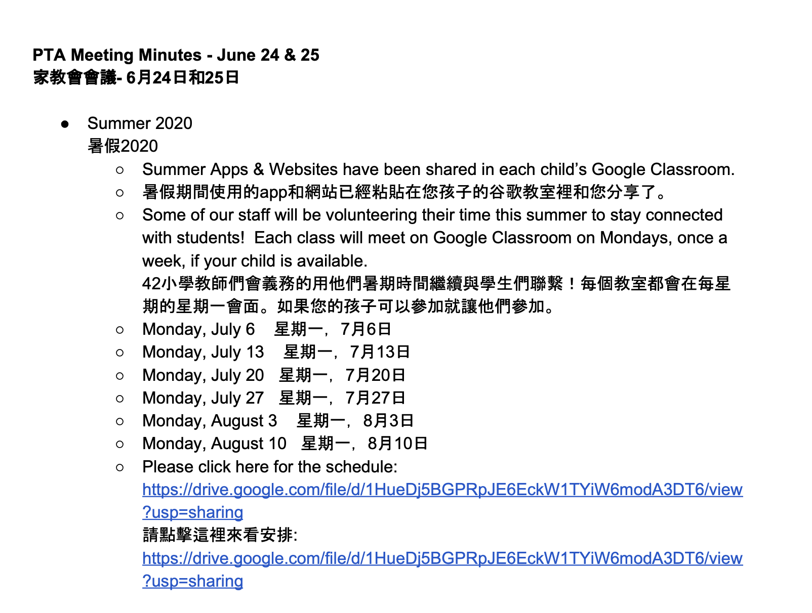 42小學教師們會義務的用他們暑期時間繼續與學生們聯繫!每個教室都會在每星期的星期一會面。如果您的孩子可以參加就讓他們參加。