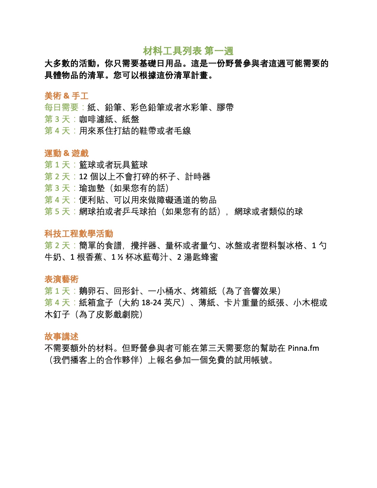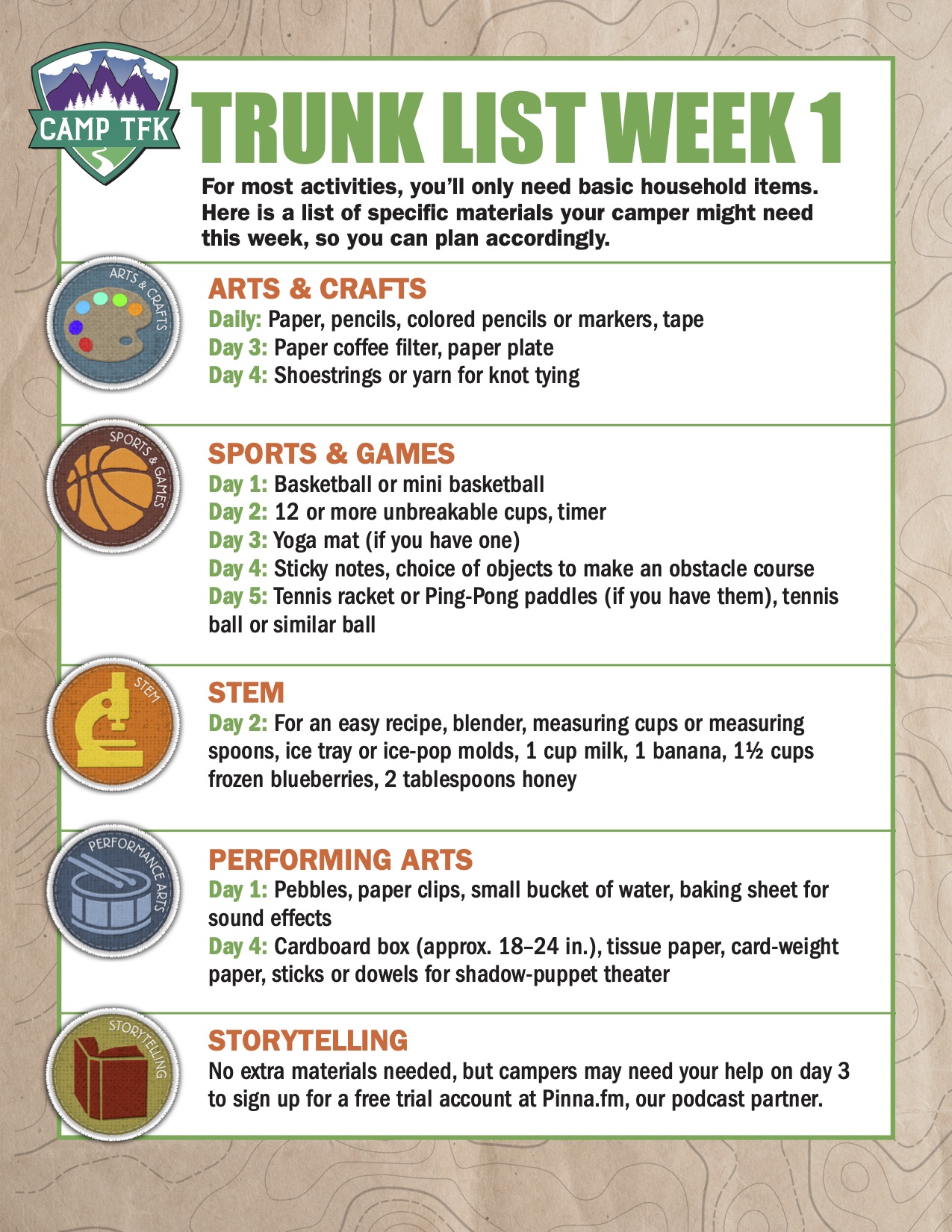 活動可以在這個網站上找到 https://time.com/5853916/camp-tfk/。我們建議您先註冊報名。每一周,註冊報名的人會收到一封郵件預覽接下來這一一周的活動,包括一系列需要的材料和工具。 (我們會限制需要購買的材料;絕大多是的東西都是您家裡可能已經有的。)每個工作日的早上,一個TFK野營活動的當日日程安排也會發到您的郵箱。