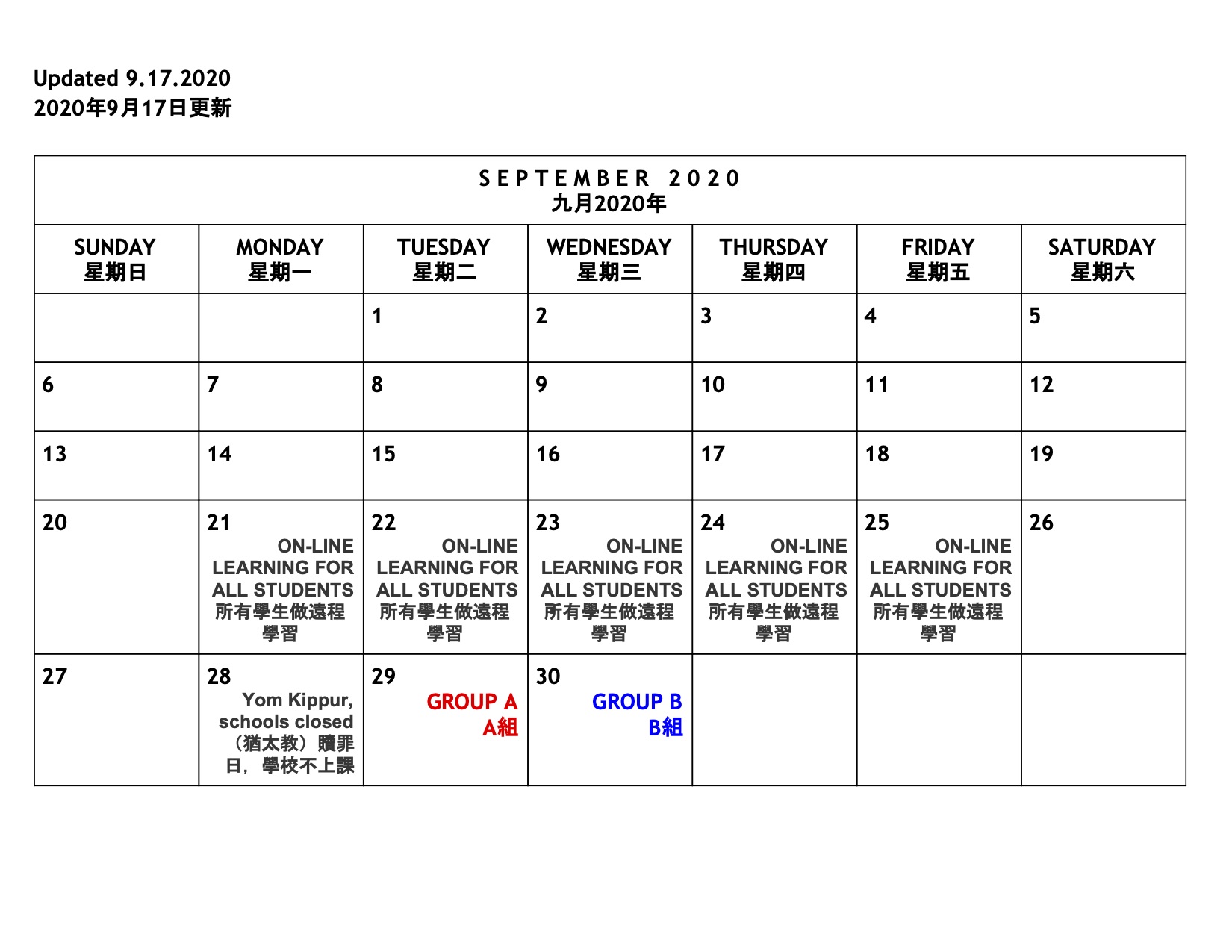 Update on School Year 2020-2021 最新的開學信息